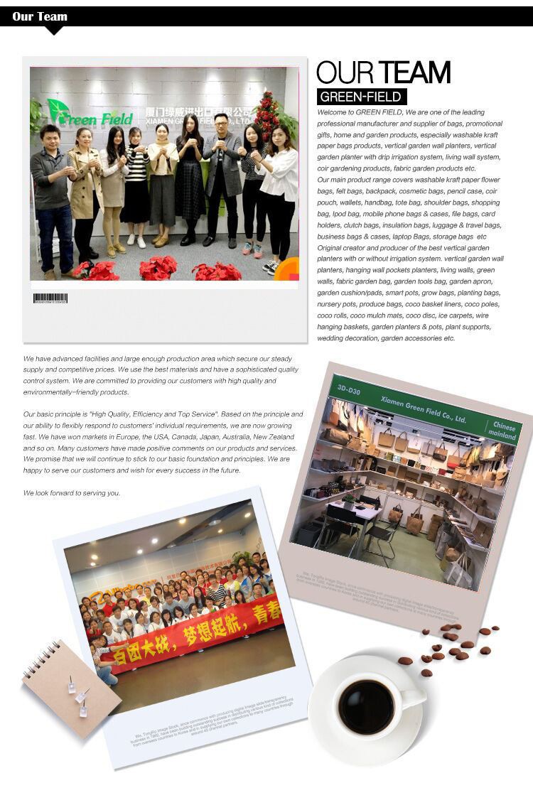 Green Field: Vi tillverkar olika typer av väskor. Vår professionella designer och produktion använder alltid det miljövänliga{{0}}}miljövänliga och återvinningsbara materialet för att göra produkten enligt våra kunders krav. Vår produktion med över 160 set enkelsymaskiner, 70 set med dubbelnålsmaskiner, 6 set Bar-Tac och 3 set pumpskärmaskiner och symaskin med högt -huvud, etc. Alla produkter tillhandahålls av Green Field kommer att inspekteras av vårt team på standard AQL 4.0, har åtnjutit högt anseende från våra kunder.